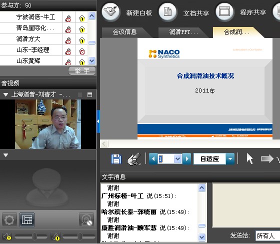 行业:润滑技术交流2011年11月11日,润滑行业技术远程交流会-道普化学专场第五期顺利举行。会议主题:合成润滑油技术概况。国内众多润滑油行业人士共同深入探讨,大家发言踊跃,气氛活跃,而道普视屏会议再一次成为大家交流的优质平台。
